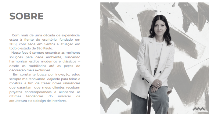 Seu trabalho é pautado em unir arquitetura contemporânea e atemporal, integrando estilos modernos e clássicos, desde mobiliários até peças de design exclusivas. O resultado são ambientes que equilibram estética, funcionalidade e bem-estar, sempre alinhados às expectativas e estilo de vida de cada cliente.